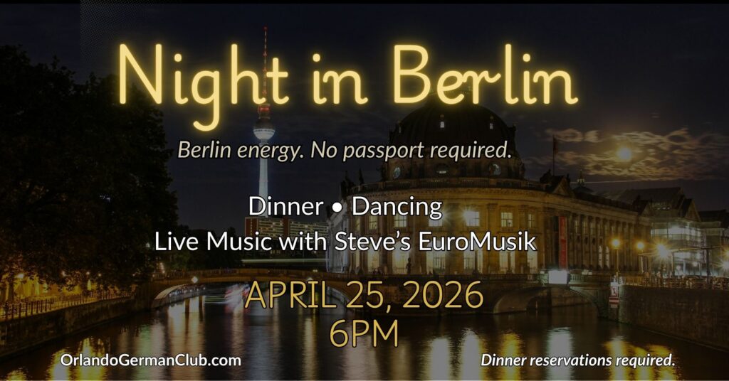 The German American Society of Central Florida holds events every month where you’ll get a chance to mingle and connect with other members. You’ll also enjoy discounted rates to our fun dinner dances featuring LIVE MUSIC!